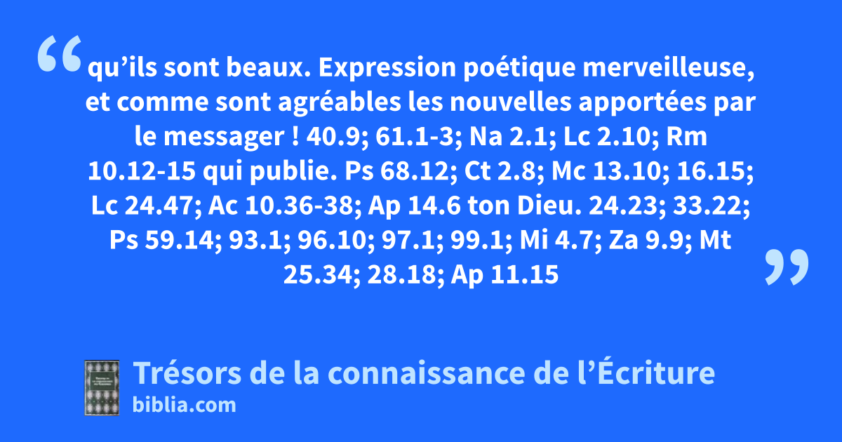 qu’ils sont beaux. Expression poétique merveilleuse, et comme sont agréables les nouvelles apportées par le messager ! 40.9; 61.1-3; Na 2.1; Lc 2.10; Rm 10.12-15 qui publie. Ps 68.12; Ct 2.8; Mc 13.10; 16.15; Lc 24.47; Ac 10.36-38; Ap 14.6 ton Dieu. 24.23; 33.22; Ps 59.14; 93.1; 96.10; 97.1; 99.1; Mi 4.7; Za 9.9; Mt 25.34; 28.18; Ap 11.15
