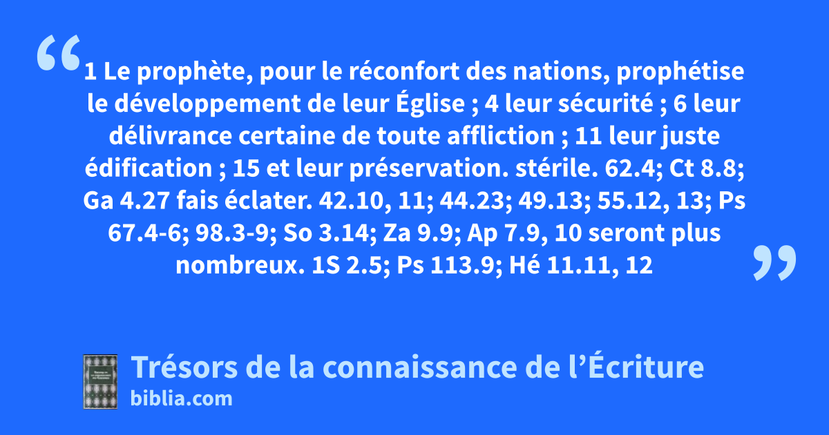 1 Le prophète, pour le réconfort des nations, prophétise le développement de leur Église ; 4 leur sécurité ; 6 leur délivrance certaine de toute affliction ; 11 leur juste édification ; 15 et leur préservation.