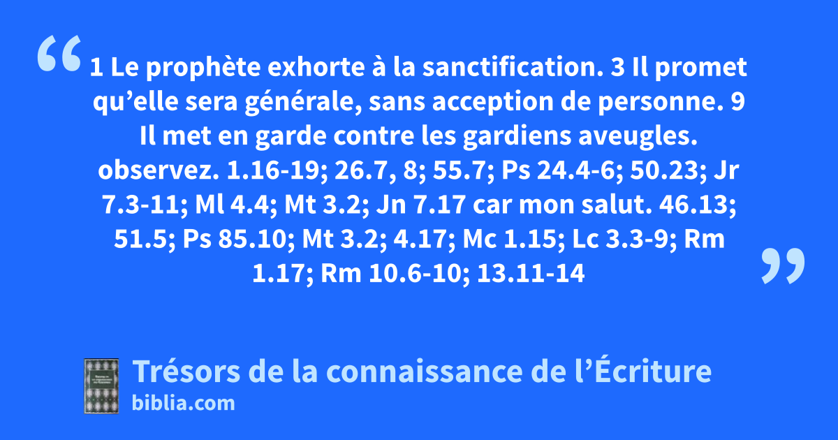 observez. 1.16-19; 26.7, 8; 55.7; Ps 24.4-6; 50.23; Jr 7.3-11; Ml 4.4; Mt 3.2; Jn 7.17 car mon salut. 46.13; 51.5; Ps 85.10; Mt 3.2; 4.17; Mc 1.15; Lc 3.3-9; Rm 1.17; Rm 10.6-10; 13.11-14