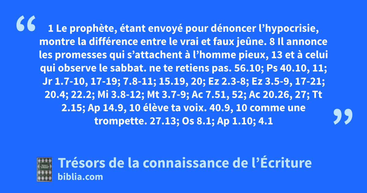 ne te retiens pas. 56.10; Ps 40.10, 11; Jr 1.7-10, 17-19; 7.8-11; 15.19, 20; Ez 2.3-8; Ez 3.5-9, 17-21; 20.4; 22.2; Mi 3.8-12; Mt 3.7-9; Ac 7.51, 52; Ac 20.26, 27; Tt 2.15; Ap 14.9, 10 élève ta voix. 40.9, 10 comme une trompette. 27.13; Os 8.1; Ap 1.10; 4.1