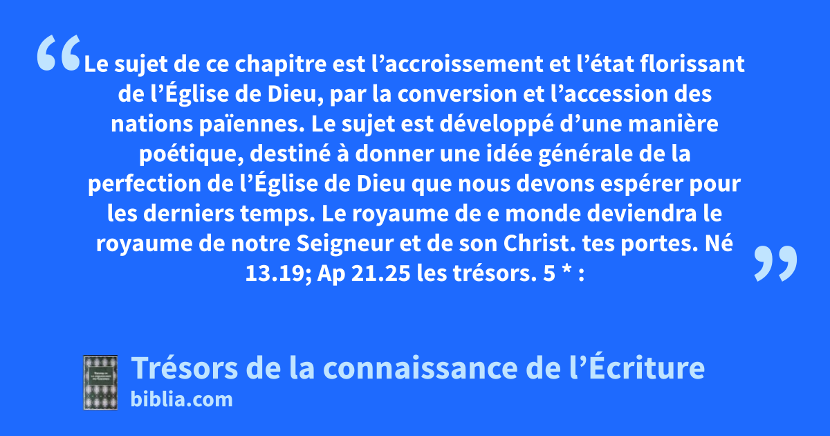 Le sujet de ce chapitre est l’accroissement et l’état florissant de l’Église de Dieu, par la conversion et l’accession des nations païennes. Le sujet est développé d’une manière poétique, destiné à donner une idée générale de la perfection de l’Église de Dieu que nous devons espérer pour les derniers temps. Le royaume de e monde deviendra le royaume de notre Seigneur et de son Christ. tes portes. Né 13.19; Ap 21.25 les trésors. 5 * :