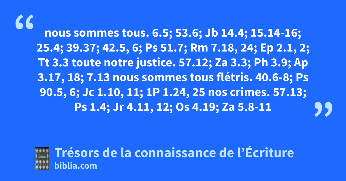 nous sommes tous. 6.5; 53.6; Jb 14.4; 15.14-16; 25.4; 39.37; 42.5, 6; Ps 51.7; Rm 7.18, 24; Ep 2.1, 2; Tt 3.3 toute notre justice. 57.12; Za 3.3; Ph 3.9; Ap 3.17, 18; 7.13 nous sommes tous flétris. 40.6-8; Ps 90.5, 6; Jc 1.10, 11; 1P 1.24, 25 nos crimes. 57.13; Ps 1.4; Jr 4.11, 12; Os 4.19; Za 5.8-11