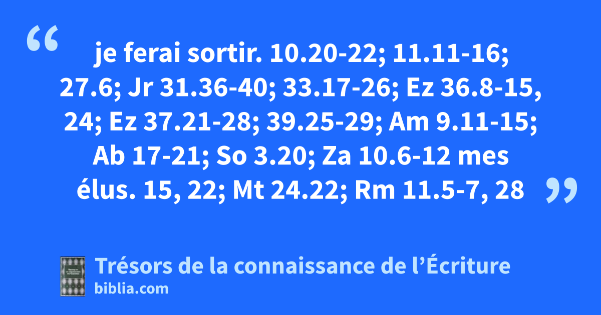 je ferai sortir. 10.20-22; 11.11-16; 27.6; Jr 31.36-40; 33.17-26; Ez 36.8-15, 24; Ez 37.21-28; 39.25-29; Am 9.11-15; Ab 17-21; So 3.20; Za 10.6-12 mes élus. 15, 22; Mt 24.22; Rm 11.5-7, 28