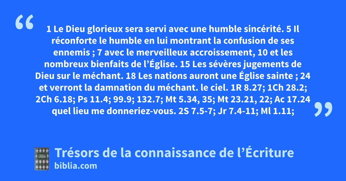 1 Le Dieu glorieux sera servi avec une humble sincérité. 5 Il réconforte le humble en lui montrant la confusion de ses ennemis ; 7 avec le merveilleux accroissement, 10 et les nombreux bienfaits de l’Église. 15 Les sévères jugements de Dieu sur le méchant. 18 Les nations auront une Église sainte ; 24 et verront la damnation du méchant.
