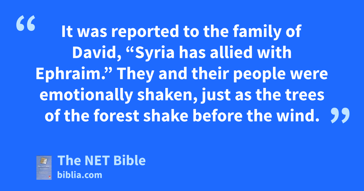 7:2 It was reported to the family4 of David, “Syria has allied with5 Ephraim.” They and their people were emotionally shaken, just as the trees of the forest shake before the wind.6 7:3 So the Lord told Isaiah, “Go out with your son Shear-jashub7 and meet Ahaz at the end of the conduit of the upper pool which is located on the road to the field where they wash and dry cloth.8 7:4 Tell him, ‘Make sure you stay calm!9 Don’t be afraid! Don’t be intimidated10 by these two stubs of smoking logs,11 or by the raging anger of Rezin, Syria, and the son of Remaliah. 7:5 Syria has plotted with Ephraim and the son of Remaliah to bring about your demise.12 7:6 They say, “Let’s attack Judah, terrorize it, and conquer it.13 Then we’ll set up the son of Tabeel as its king.”14 7:7 For this reason the sovereign master,15 the Lord, says: