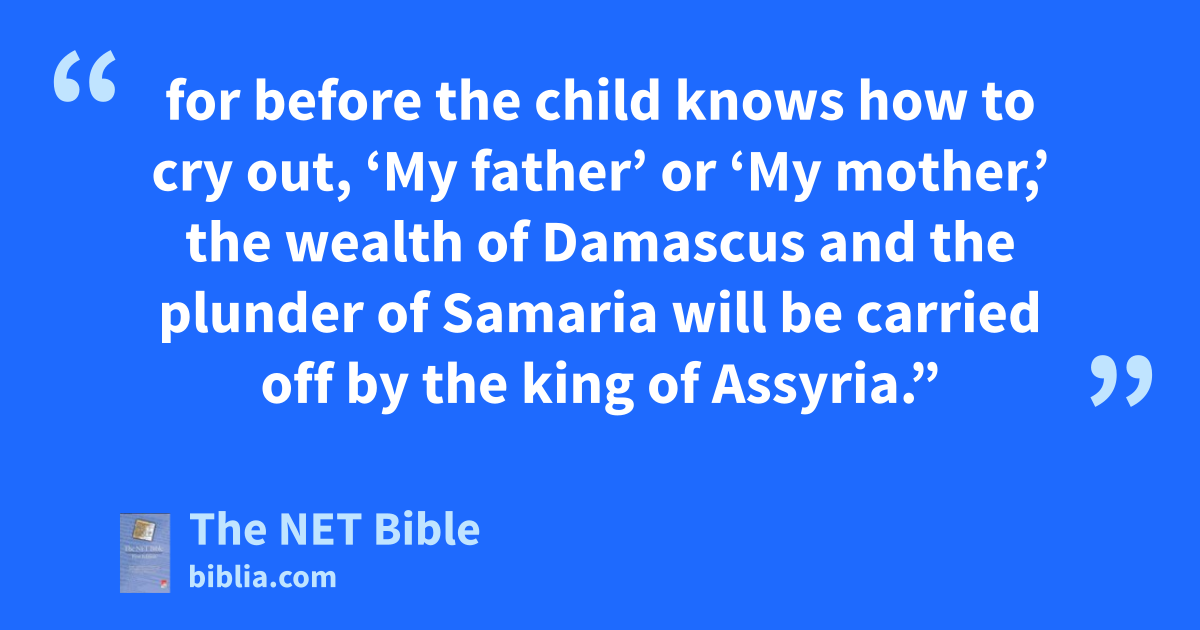 8:1 The Lord told me, “Take a large tablet1 and inscribe these words2 on it with an ordinary stylus:3 ‘Maher-Shalal-Hash-Baz.’4 8:2 Then I will summon5 as my reliable witnesses Uriah the priest and Zechariah son of Jeberekiah.” 8:3 I then had sexual relations with the prophetess; she conceived and gave birth to a son. The Lord told me, “Name him Maher-Shalal-Hash-Baz, 8:4 for before the child knows how to cry out, ‘My father’ or ‘My mother,’ the wealth of Damascus and the plunder of Samaria6 will be carried off by the king of Assyria.”7