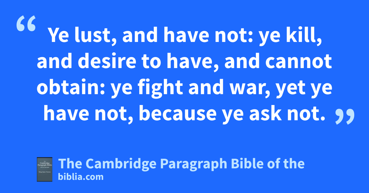 IV. From whence come wars and * fightings among you? come they not hence, even of your * lusts athat war in your members? 2 Ye lust, and have not: ye * bkill, and cdesire to have, and cannot obtain: ye fight and war, yet ye have not, because ye ask not. 3 dYe ask, and receive not, ebecause ye ask amiss, that ye may consume it upon your * lusts. 4 fYe adulterers and adulteresses, know ye not that gthe friendship of the world is henmity with God? iwhosoever therefore will be a friend of the world is the enemy of God. 5 Do ye think that kthe scripture saith in vain, lthe spirit that dwelleth in us lusteth * to envy? 6 But mhe giveth more grace. Wherefore nhe saith, oGod resisteth the proud, but giveth grace unto the humble. 7 opSubmit yourselves therefore to God. qResist the devil, and he will flee from you. 8 rDraw nigh to God, and he will draw nigh to you. sCleanse your hands, ye sinners; and tpurify your hearts, ye udouble minded. 9 Be afflicted, and vmourn, and weep: let your laughter be turned to mourning, and your joy to heaviness. 10 pwHumble yourselves in the sight of the Lord, and he shall lift you up.