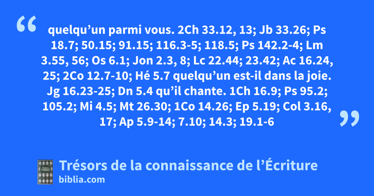 quelqu’un parmi vous. 2Ch 33.12, 13; Jb 33.26; Ps 18.7; 50.15; 91.15; 116.3-5; 118.5; Ps 142.2-4; Lm 3.55, 56; Os 6.1; Jon 2.3, 8; Lc 22.44; 23.42; Ac 16.24, 25; 2Co 12.7-10; Hé 5.7 quelqu’un est-il dans la joie. Jg 16.23-25; Dn 5.4 qu’il chante. 1Ch 16.9; Ps 95.2; 105.2; Mi 4.5; Mt 26.30; 1Co 14.26; Ep 5.19; Col 3.16, 17; Ap 5.9-14; 7.10; 14.3; 19.1-6