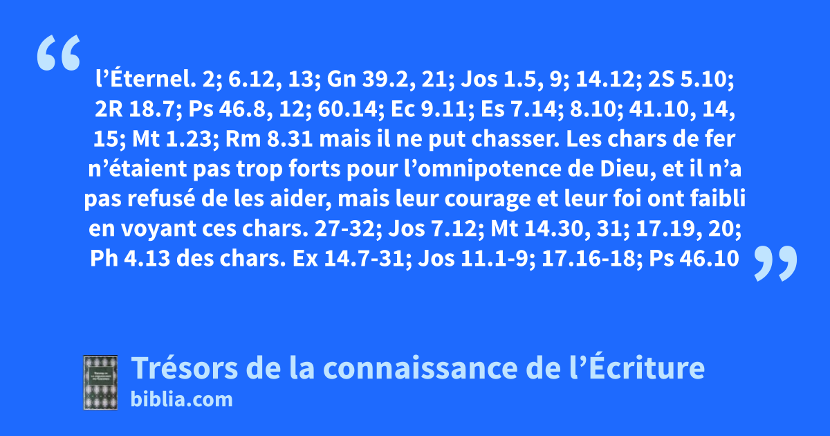l’Éternel. 2; 6.12, 13; Gn 39.2, 21; Jos 1.5, 9; 14.12; 2S 5.10; 2R 18.7; Ps 46.8, 12; 60.14; Ec 9.11; Es 7.14; 8.10; 41.10, 14, 15; Mt 1.23; Rm 8.31 mais il ne put chasser. Les chars de fer n’étaient pas trop forts pour l’omnipotence de Dieu, et il n’a pas refusé de les aider, mais leur courage et leur foi ont faibli en voyant ces chars. 27-32; Jos 7.12; Mt 14.30, 31; 17.19, 20; Ph 4.13 des chars. Ex 14.7-31; Jos 11.1-9; 17.16-18; Ps 46.10