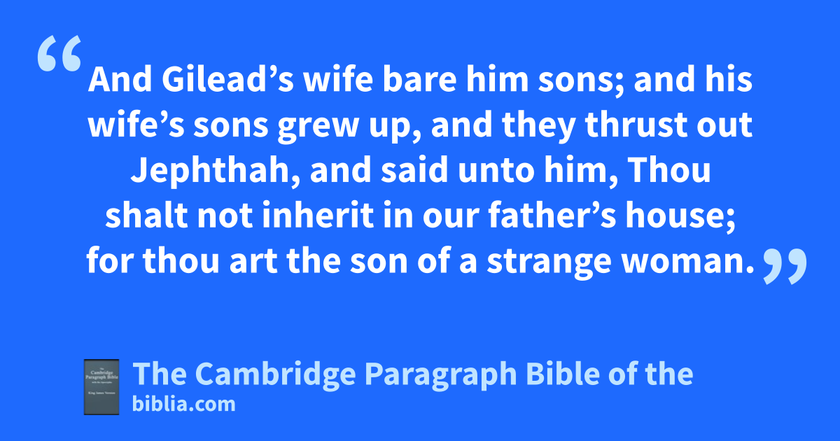 XI. Now * Jephthah the Gileadite was aa mighty man of valour, and he was the son of * a harlot: and Gilead begat Jephthah. 2 And Gilead’s wife bare him sons; and his wife’s sons grew up, and they thrust out Jephthah, and said unto him, Thou shalt not inherit in our father’s house; for thou art the son of a strange woman. 3 Then Jephthah fled * from his brethren, and dwelt in the land of bTob: and there were gathered cvain men to Jephthah, and went out with him. 4 And it came to pass * in process of time, that the children of Ammon made war against Israel. 5 And it was so, that when the children of Ammon made war against Israel, dthe elders of Gilead went to fetch Jephthah out of the land of bTob: 6 and they said unto Jephthah, Come, and be our captain, that we may fight with the children of Ammon. 7 And Jephthah said unto the elders of Gilead, eDid not ye hate me, and expel me out of my father’s house? and why are ye come unto me now when ye are in distress? 8 And the elders of Gilead said unto Jephthah, Therefore we turn again to thee now, that thou mayest go with us, and fight against the children of Ammon, and be dour head over all the inhabitants of Gilead. 9 And Jephthah said unto the elders of Gilead, If ye bring me home again to fight against the children of Ammon, and the Lord deliver them before me, shall I be your head? 10 And the elders of Gilead said unto Jephthah, The Lord * be witness between us, fif we do not so according to thy words. 11 Then Jephthah went with the elders of Gilead, and the people made him ghead and captain over them: and Jephthah uttered all his words hbefore the Lord in iMizpeh.