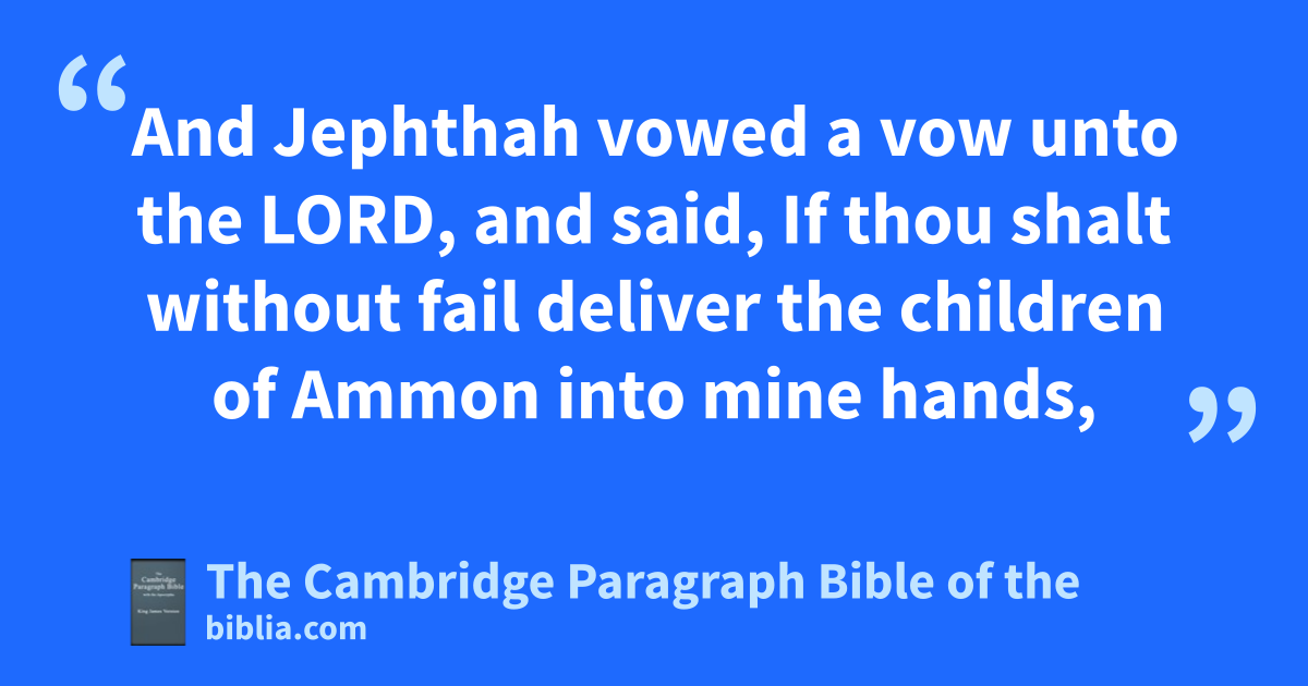 XI. Now * Jephthah the Gileadite was aa mighty man of valour, and he was the son of * a harlot: and Gilead begat Jephthah. 2 And Gilead’s wife bare him sons; and his wife’s sons grew up, and they thrust out Jephthah, and said unto him, Thou shalt not inherit in our father’s house; for thou art the son of a strange woman. 3 Then Jephthah fled * from his brethren, and dwelt in the land of bTob: and there were gathered cvain men to Jephthah, and went out with him. 4 And it came to pass * in process of time, that the children of Ammon made war against Israel. 5 And it was so, that when the children of Ammon made war against Israel, dthe elders of Gilead went to fetch Jephthah out of the land of bTob: 6 and they said unto Jephthah, Come, and be our captain, that we may fight with the children of Ammon. 7 And Jephthah said unto the elders of Gilead, eDid not ye hate me, and expel me out of my father’s house? and why are ye come unto me now when ye are in distress? 8 And the elders of Gilead said unto Jephthah, Therefore we turn again to thee now, that thou mayest go with us, and fight against the children of Ammon, and be dour head over all the inhabitants of Gilead. 9 And Jephthah said unto the elders of Gilead, If ye bring me home again to fight against the children of Ammon, and the Lord deliver them before me, shall I be your head? 10 And the elders of Gilead said unto Jephthah, The Lord * be witness between us, fif we do not so according to thy words. 11 Then Jephthah went with the elders of Gilead, and the people made him ghead and captain over them: and Jephthah uttered all his words hbefore the Lord in iMizpeh.
