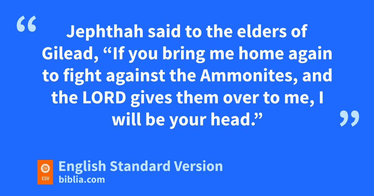 4 After a time the Ammonites made war against Israel. 5 And when the Ammonites made war against Israel, the elders of Gilead went to bring Jephthah from the land of fTob. 6 And they said to Jephthah, “Come and be our leader, that we may fight against the Ammonites.” 7 But Jephthah said to the elders of Gilead, “Did you not hate me and drive me out of my father’s house? Why have you come to me now when you are in distress?” 8 And the elders of Gilead said to Jephthah, “That is why we have turned to you now, that you may go with us and fight against the Ammonites and hbe our head over all the inhabitants of Gilead.” 9 Jephthah said to the elders of Gilead, “If you bring me home again to fight against the Ammonites, and the Lord gives them over to me, I will be your head.” 10 And the elders of Gilead said to Jephthah, i“The Lord will be witness between us, if we do not do as you say.” 11 So Jephthah went with the elders of Gilead, and the people jmade him head and leader over them. And Jephthah spoke all his words kbefore the Lord at lMizpah.