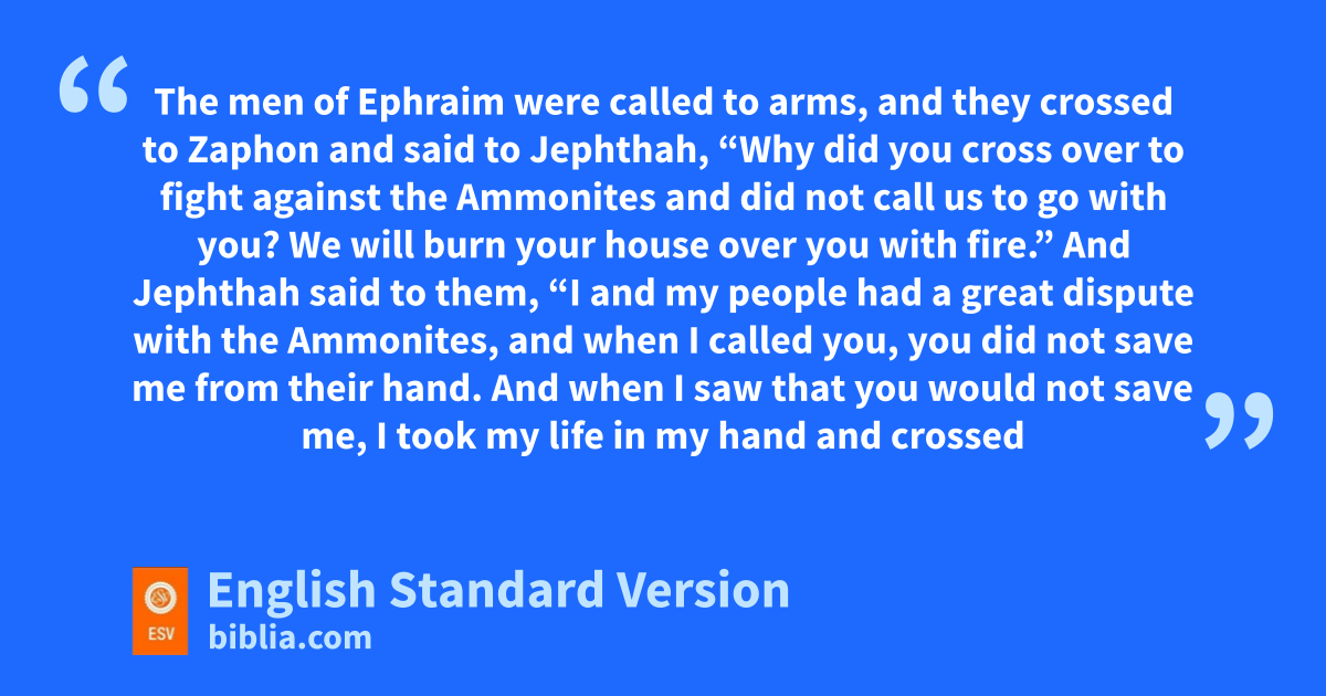 12 oThe men of Ephraim were called to arms, and they crossed to Zaphon and said to Jephthah, “Why did you cross over to fight against the Ammonites and did not call us to go with you? We will burn your house over you with fire.” 2 And Jephthah said to them, “I and my people had a great dispute with the Ammonites, and when I called you, you did not save me from their hand. 3 And when I saw that you would not save me, pI took my life in my hand and crossed over against the Ammonites, and the Lord gave them into my hand. Why then have you come up to me this day to fight against me?” 4 Then Jephthah gathered all the men of Gilead and fought with Ephraim. And the men of Gilead struck Ephraim, because they said, q“You are fugitives of Ephraim, you Gileadites, in the midst of Ephraim and Manasseh.” 5 And the Gileadites captured rthe fords of the Jordan against the Ephraimites. And when any of the fugitives of Ephraim said, “Let me go over,” the men of Gilead said to him, “Are you an Ephraimite?” When he said, “No,” 6 they said to him, “Then say Shibboleth,” and he said, “Sibboleth,” for he could not pronounce it right. Then they seized him and slaughtered him at rthe fords of the Jordan. At that time 42,000 of the Ephraimites fell.