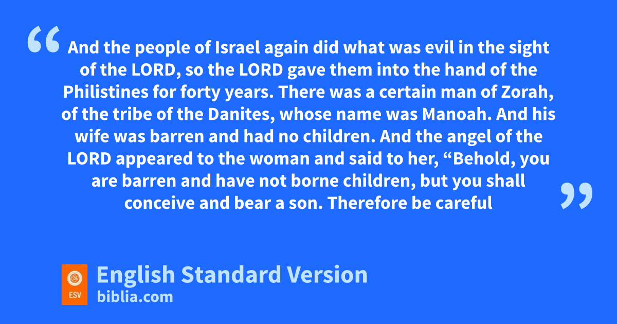 2 There was a certain man of wZorah, of the tribe of the Danites, whose name was Manoah. xAnd his wife was barren and had no children. 3 yAnd the angel of the Lord appeared to the woman and said to her, “Behold, you are barren and have not borne children, but you shall conceive and bear a son. 4 Therefore be careful zand drink no wine or strong drink, and eat nothing unclean, 5 for behold, you shall conceive and bear a son. aNo razor shall come upon his head, for the child shall be za Nazirite to God from the womb, and he shall bbegin to save Israel from the hand of the Philistines.” 6 Then the woman came and told her husband, c“A man of God came to me, and his appearance was like the appearance of the angel of God, very awesome. dI did not ask him where he was from, and he did not tell me his name, 7 but he said to me, e‘Behold, you shall conceive and bear a son. So then drink no wine or strong drink, and eat nothing unclean, for the child shall be a Nazirite to God from the womb to the day of his death.’ ”