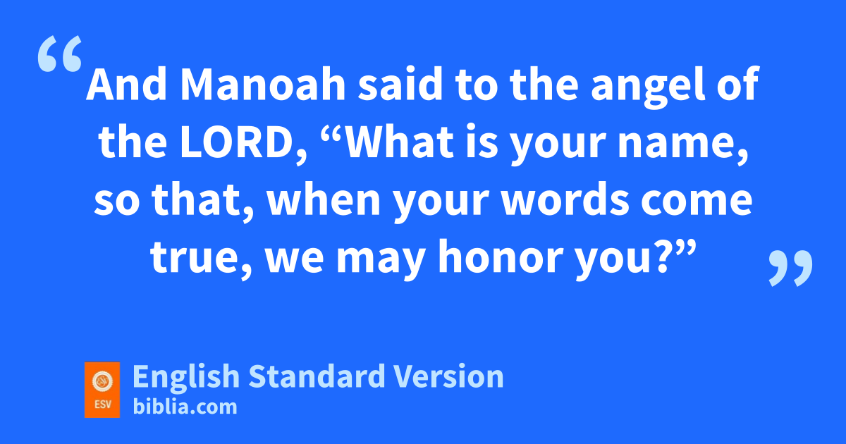 15 Manoah said to the angel of the Lord, “Please let us detain you and hprepare a young goat for you.” 16 And the angel of the Lord said to Manoah, “If you detain me, I will not eat of your food. But if you prepare a burnt offering, then offer it to the Lord.” (For Manoah did not know that he was the angel of the Lord.) 17 And Manoah said to the angel of the Lord, i“What is your name, so that, when your words come true, we may honor you?” 18 And the angel of the Lord said to him, j“Why do you ask my name, seeing kit is wonderful?” 19 So lManoah took the young goat with the grain offering, and offered it on the rock to the Lord, to the one who works1 wonders, and Manoah and his wife were watching. 20 And when the flame went up toward heaven from the altar, the angel of the Lord went up in the flame of the altar. Now Manoah and his wife were watching, mand they fell on their faces to the ground.