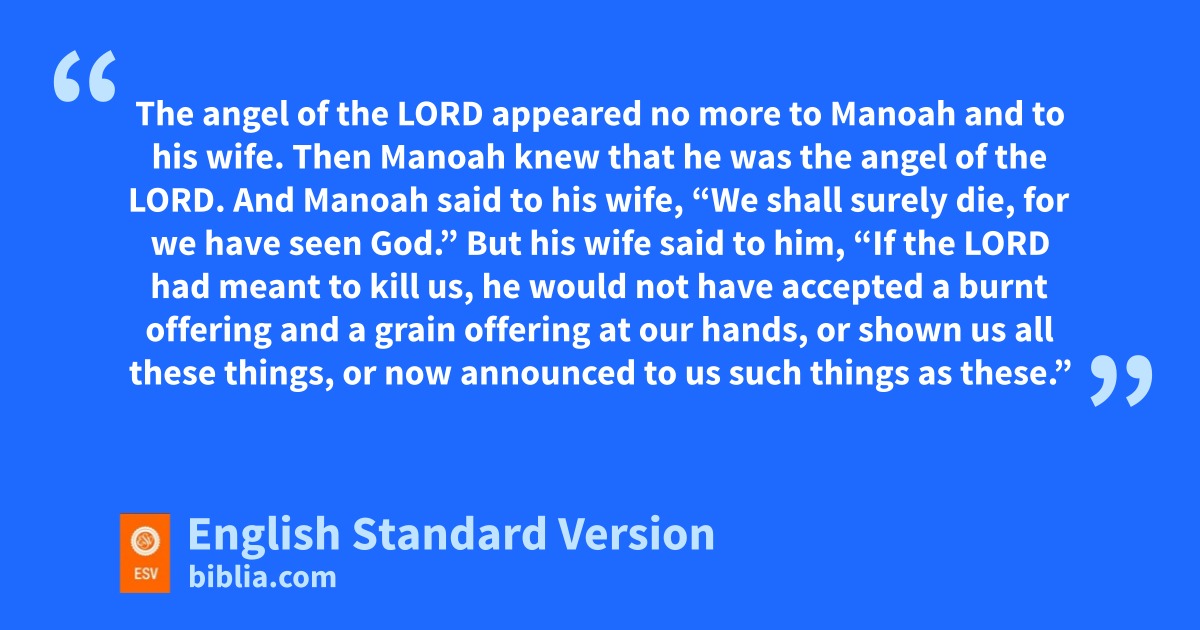 21 The angel of the Lord appeared no more to Manoah and to his wife. nThen Manoah knew that he was the angel of the Lord. 22 And Manoah said to his wife, n“We shall surely die, for we have seen God.” 23 But his wife said to him, “If the Lord had meant to kill us, he would not have accepted a burnt offering and a grain offering at our hands, or shown us all these things, or now announced to us such things as these.” 24 And the woman bore a son and called his name Samson. oAnd the young man grew, and the Lord blessed him. 25 pAnd the Spirit of the Lord began to stir him in Mahaneh-dan, between qZorah and Eshtaol.