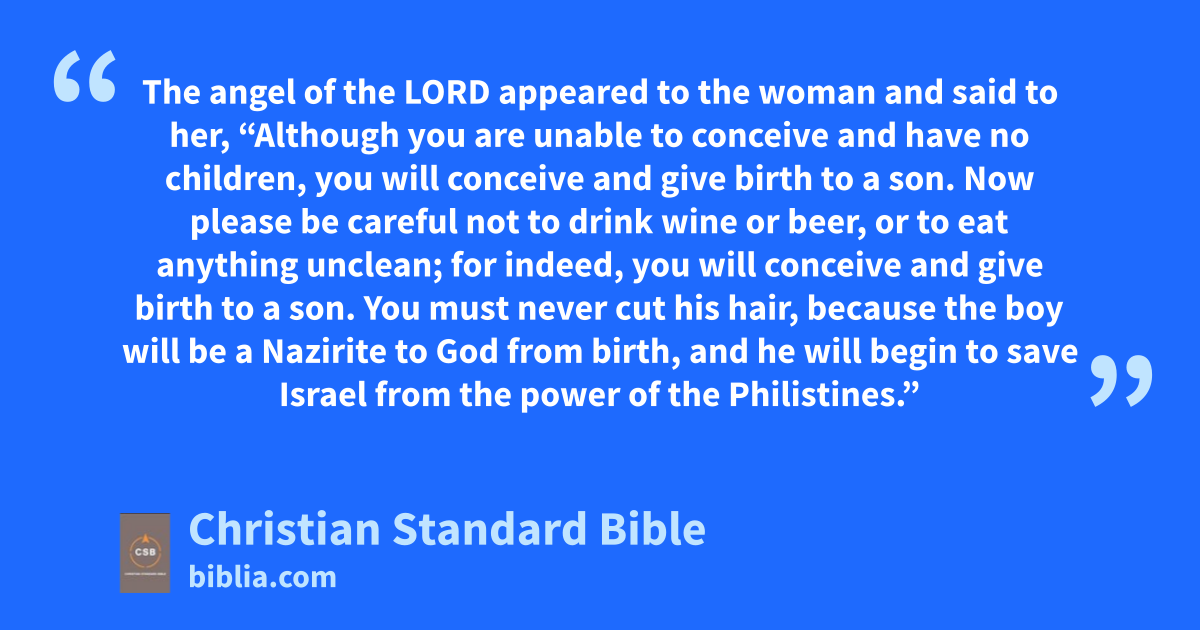 13 The Israelites again did what was evil in the Lord’s sight,e so the Lord handed them over to the Philistines forty years. 2 There was a certain man from Zorah,f from the family of Dan, whose name was Manoah; his wife was unable to conceive and had no children. 3 The angel of the Lord appeared to the woman and said to her, “Although you are unable to conceive and have no children, you will conceive and give birth to a son. 4 Now please be careful not to drink wine or beer,g or to eat anything unclean;h 5 for indeed, you will conceive and give birth to a son. You must never cut his hair,A because the boy will be a Naziritei to God from birth, and he will begin to save Israel from the power of the Philistines.”