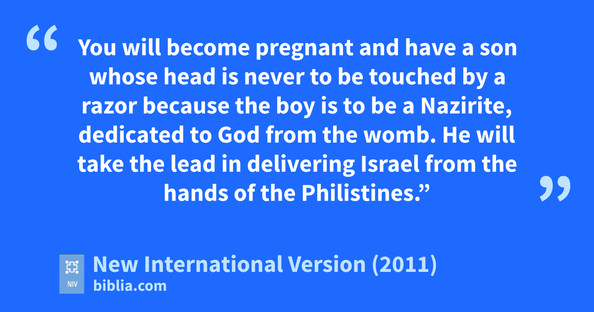 2 A certain man of Zorah,s named Manoah,t from the clan of the Danites,u had a wife who was childless,v unable to give birth. 3 The angel of the Lordw appeared to herx and said, “You are barren and childless, but you are going to become pregnant and give birth to a son.y 4 Now see to it that you drink no wine or other fermented drinkz and that you do not eat anything unclean.a 5 You will become pregnant and have a sonb whose head is never to be touched by a razorc because the boy is to be a Nazirite,d dedicated to God from the womb. He will take the leade in delivering Israel from the hands of the Philistines.”