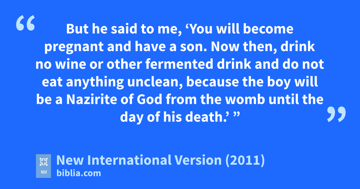 6 Then the woman went to her husband and told him, “A man of Godf came to me. He looked like an angel of God,g very awesome.h I didn’t ask him where he came from, and he didn’t tell me his name. 7 But he said to me, ‘You will become pregnant and have a son. Now then, drink no winei or other fermented drinkj and do not eat anything unclean, because the boy will be a Nazirite of God from the womb until the day of his death.k’ ”