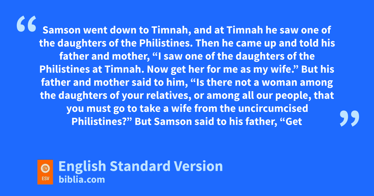 14 rSamson went down to sTimnah, and at Timnah he saw one of the daughters of the Philistines. 2 Then he came up and told his father and mother, “I saw one of the daughters of the Philistines at Timnah. tNow get her for me as my wife.” 3 But his father and mother said to him, “Is there not a woman among the daughters uof your relatives, or among all our people, that you must go to take a wife from the vuncircumcised Philistines?” But Samson said to his father, “Get her for me, for she is right in my eyes.”