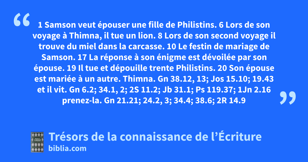 1 Samson veut épouser une fille de Philistins. 6 Lors de son voyage à Thimna, il tue un lion. 8 Lors de son second voyage il trouve du miel dans la carcasse. 10 Le festin de mariage de Samson. 17 La réponse à son énigme est dévoilée par son épouse. 19 Il tue et dépouille trente Philistins. 20 Son épouse est mariée à un autre.