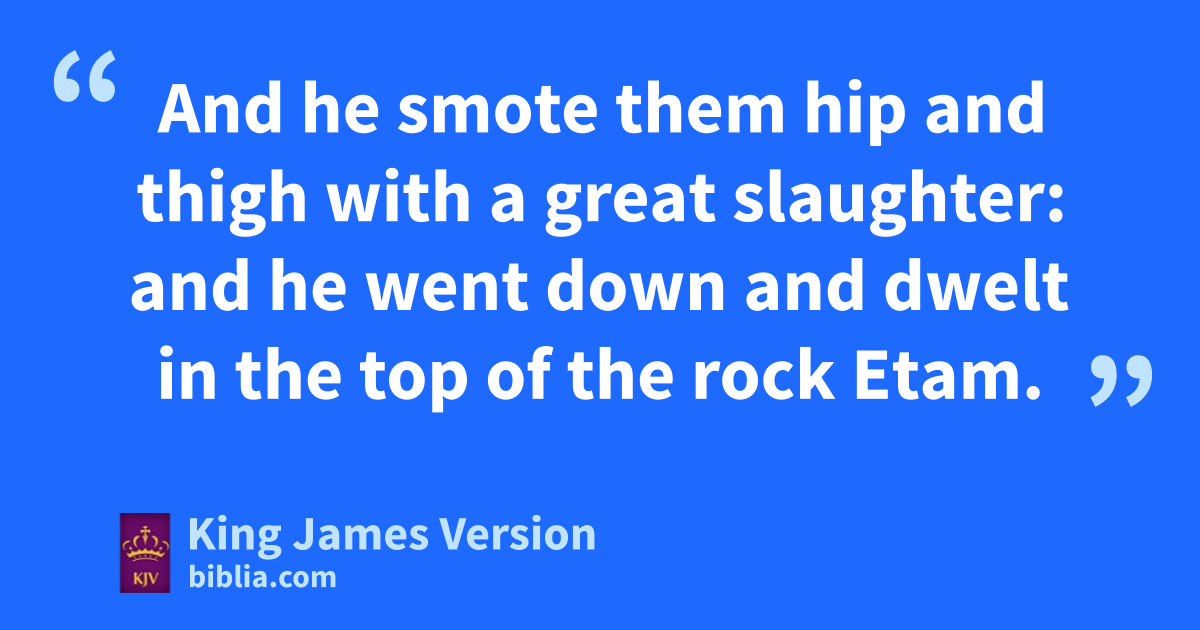 15 *But it came to pass within a while after, in the time of wheat harvest, that Samson visited his wife with aa kid; and he said, I will go in to my wife into the chamber. But her father would not suffer him to go in. 2 And her father said, I verily thought that thou hadst utterly hated her; therefore I gave her to thy companion: is not her younger sister fairer than she? †take her, I pray thee, instead of her. 3 And Samson said concerning them, ||Now shall I be more blameless than the Philistines, though I do them a displeasure. 4 And Samson went and caught three hundred foxes, and took ||firebrands, and turned tail to tail, and put a firebrand in the midst between two tails. 5 And when he had set the brands on fire, he let them go into the standing corn of the Philistines, and burnt up both bthe shocks, and also bthe standing corn, with the vineyards and olives. 6 Then the Philistines said, Who hath done this? And they answered, Samson, the son in law of the Timnite, because he had taken his wife, and given her to his companion. And the Philistines came up, and cburnt her and her father with fire. 7 And Samson said unto them, Though ye have done this, yet will I be avenged of you, and after that I will cease. 8 And he smote them hip and thigh with a great slaughter: and he went down and dwelt in dthe top of the rock eEtam.