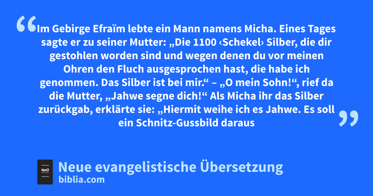 17 1 Im Gebirge Efraïm lebte ein Mann namens Micha. 2 Eines Tages sagte er zu seiner Mutter: „Die 1100 ‹Schekel› Silber, die dir gestohlen worden sind und wegen denen du vor meinen Ohren den Fluch ausgesprochen hast, die habe ich genommen. Das Silber ist bei mir.“ – „O mein Sohn!“, rief da die Mutter, „Jahwe segne dich!“ 3 Als Micha ihr das Silber zurückgab, erklärte sie: „Hiermit weihe ich es Jahwe. Es soll ein Schnitz-Gussbild daraus gemacht werden! Damit kommt es auch dir zugute.“ 4 Sie nahm 200 ‹Schekel› von dem Silber und ließ vom Feinschmied ein solches Gussbild1 daraus machen. Micha stellte die Figur bei sich auf. 5 So kam Micha zu einem eigenen Heiligtum. Er ließ auch ein Efod und einige Terafim2 anfertigen und setzte dann einen von seinen Söhnen als Priester ein.
