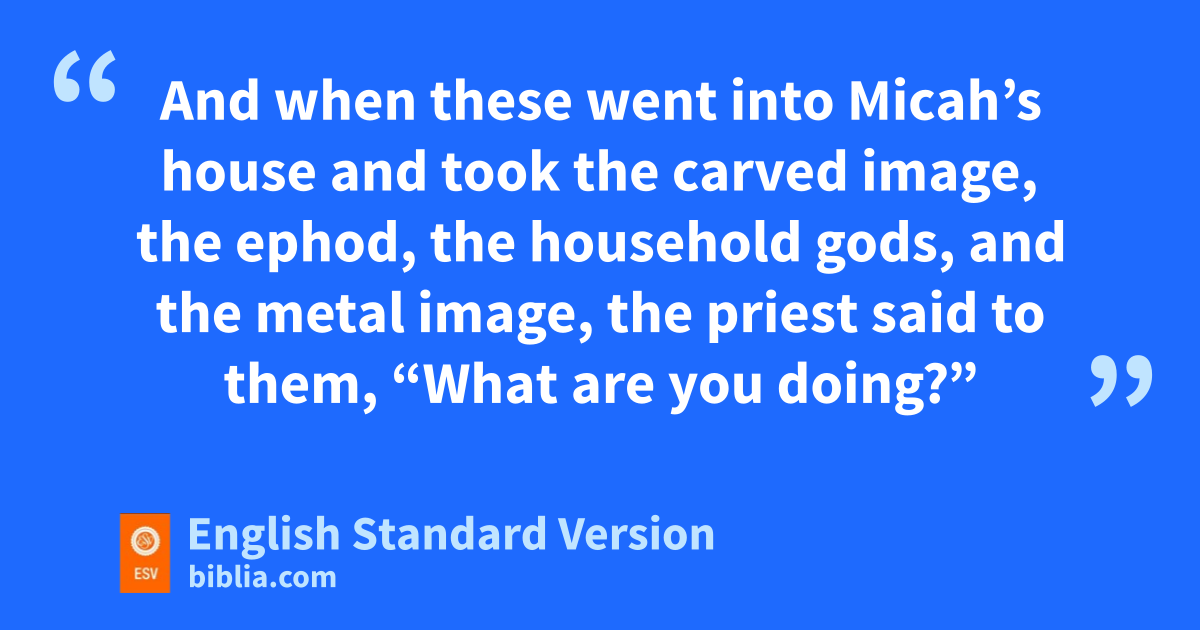 14 Then the five men who had gone to scout out the country of Laish said to their brothers, “Do you know that ein these houses there are an ephod, household gods, a carved image, and a metal image? Now therefore consider what you will do.” 15 And they turned aside there and came to the house of the young Levite, at the home of Micah, and fasked him about his welfare. 16 Now the 600 men of the Danites, garmed with their weapons of war, stood by the entrance of the gate. 17 And hthe five men who had gone to scout out the land went up and entered and took ithe carved image, the ephod, the household gods, and the metal image, while the priest stood by the entrance of the gate with the 600 men armed with weapons of war. 18 And when these went into Micah’s house and took ithe carved image, the ephod, the household gods, and the metal image, the priest said to them, “What are you doing?” 19 And they said to him, “Keep quiet; jput your hand on your mouth and come with us and be to us ka father and a priest. Is it better for you to be priest to the house of one man, or to be priest to a tribe and clan in Israel?” 20 And the priest’s heart was glad. He took the ephod and the household gods and the carved image and went along with the people.