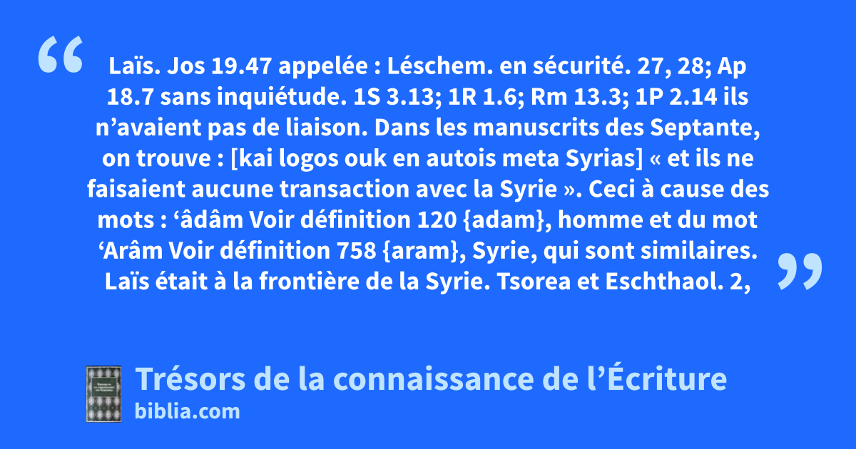 Laïs. Jos 19.47 appelée : Léschem. en sécurité. 27, 28; Ap 18.7 sans inquiétude. 1S 3.13; 1R 1.6; Rm 13.3; 1P 2.14 ils n’avaient pas de liaison. Dans les manuscrits des Septante, on trouve : [kai logos ouk en autois meta Syrias] « et ils ne faisaient aucune transaction avec la Syrie ». Ceci à cause des mots : ‘âdâm Voir définition 120 {adam}, homme et du mot ‘Arâm Voir définition 758 {aram}, Syrie, qui sont similaires. Laïs était à la frontière de la Syrie.
