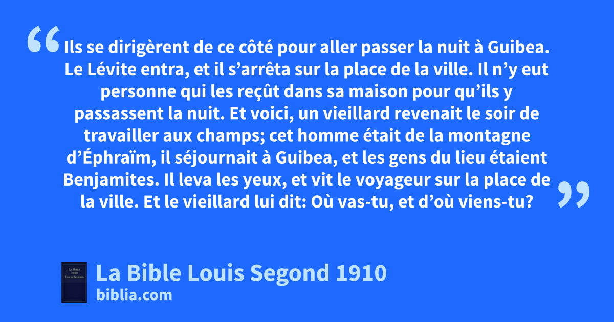 1Dans ce temps où ail n’y avait point de roi en Israël, un Lévite, qui séjournait à l’extrémité de la montagne d’Éphraïm, prit pour sa concubine une femme de Bethléhem de Juda. 2Sa concubine lui fit infidélité, et elle le quitta pour aller dans la maison de son père à Bethléhem de Juda, où elle resta l’espace de quatre mois. 3Son mari se leva et alla vers elle, pour parler à son coeur et la ramener. Il avait avec lui son serviteur et deux ânes. Elle le fit entrer dans la maison de son père; et quand le père de la jeune femme le vit, il le reçut avec joie. 4Son beau-père, le père de la jeune femme, le retint trois jours chez lui. Ils mangèrent et burent, et ils y passèrent la nuit. 5Le quatrième jour, ils se levèrent de bon matin, et le Lévite se disposait à partir. Mais le père de la jeune femme dit à son gendre: Prends un morceau de pain pour fortifier ton coeur; vous partirez ensuite. 6Et ils s’assirent, et ils mangèrent et burent eux deux ensemble. Puis le père de la jeune femme dit au mari: Décide-toi donc à passer la nuit, et que ton coeur se réjouisse. 7Le mari se levait pour s’en aller; mais, sur les instances de son beau-père, il passa encore la nuit. 8Le cinquième jour, il se leva de bon matin pour partir. Alors le père de la jeune femme dit: Fortifie ton coeur, je te prie; et restez jusqu’au déclin du jour. Et ils mangèrent eux deux. 9Le mari se levait pour s’en aller, avec sa concubine et son serviteur; mais son beau-père, le père de la jeune femme, lui dit: Voici, le jour baisse, il se fait tard, passez donc la nuit; voici, le jour est sur son déclin, passe ici la nuit, et que ton coeur se réjouisse; demain vous vous lèverez de bon matin pour vous mettre en route, et tu t’en iras à ta tente. 10Le mari ne voulut point passer la nuit, il se leva et partit. Il arriva jusque devant Jebus, qui est Jérusalem, avec les deux ânes bâtés et avec sa concubine. 11Lorsqu’ils furent près de Jebus, le jour avait beaucoup baissé. Le serviteur dit alors à son maître: Allons, dirigeons-nous vers cette ville des Jébusiens, et nous y passerons la nuit. 12Son maître lui répondit: Nous n’entrerons pas dans une ville d’étrangers, où il n’y a point d’enfants d’Israël, nous irons jusqu’à Guibea. 13Il dit encore à son serviteur: Allons, approchons-nous de l’un de ces lieux, Guibea ou Rama, et nous y passerons la nuit. 14Ils continuèrent à marcher, et le soleil se coucha quand ils furent près de Guibea, qui appartient à Benjamin. 15Ils se dirigèrent de ce côté pour aller passer la nuit à Guibea. Le Lévite entra, et il s’arrêta sur la place de la ville. Il n’y eut personne qui les reçût dans sa maison pour qu’ils y passassent la nuit. 16Et voici, un vieillard revenait le soir de travailler aux champs; cet homme était de la montagne d’Éphraïm, il séjournait à Guibea, et les gens du lieu étaient Benjamites. 17Il leva les yeux, et vit le voyageur sur la place de la ville. Et le vieillard lui dit: Où vas-tu, et d’où viens-tu? 18Il lui répondit: Nous allons de Bethléhem de Juda jusqu’à l’extrémité de la montagne d’Éphraïm, d’où je suis. J’étais allé à Bethléhem de Juda, et je me rends à la maison de l’Éternel. Mais il n’y a personne qui me reçoive dans sa demeure. 19Nous avons cependant de la paille et du fourrage pour nos ânes; nous avons aussi du pain et du vin pour moi, pour ta servante, et pour le garçon qui est avec tes serviteurs. Il ne nous manque rien. 20Le vieillard dit: Que la paix soit avec toi! Je me charge de tous tes besoins, tu ne passeras pas la nuit sur la place. 21Il les fit entrer dans sa maison, et il donna du fourrage aux ânes. Les voyageurs se lavèrent les pieds; puis ils mangèrent et burent. 22Pendant qu’ils étaient à se réjouir, voici, les hommes de la ville, bgens pervers, entourèrent la maison, frappèrent à la porte, et dirent au vieillard, maître de la maison: Fais sortir l’homme qui est entré chez toi, pour que nous le connaissions. 23Le maître de la maison, se présentant à eux, leur dit: Non, mes frères, ne faites pas le mal, je vous prie; puisque cet homme est entré dans ma maison, ne commettez pas cette infamie. 24Voici, j’ai une fille vierge, et cet homme a une concubine; je vous les amènerai dehors; vous les déshonorerez, et vous leur ferez ce qu’il vous plaira. Mais ne commettez pas sur cet homme une action aussi infâme. 25Ces gens ne voulurent point l’écouter. Alors l’homme prit sa concubine, et la leur amena dehors. Ils la connurent, et ils abusèrent d’elle toute la nuit jusqu’au matin; puis ils la renvoyèrent au lever de l’aurore. 26Vers le matin, cette femme alla tomber à l’entrée de la maison de l’homme chez qui était son mari, et elle resta là jusqu’au jour. 27Et le matin, son mari se leva, ouvrit la porte de la maison, et sortit pour continuer son chemin. Mais voici, la femme, sa concubine, était étendue à l’entrée de la maison, les mains sur le seuil. 28Il lui dit: Lève-toi, et allons-nous-en. Elle ne répondit pas. Alors le mari la mit sur un âne, et partit pour aller dans sa demeure. 29Arrivé chez lui, il prit un couteau, saisit sa concubine, et la coupa membre par membre en douze morceaux, qu’il envoya dans tout le territoire d’Israël. 30Tous ceux qui virent cela dirent: Jamais rien de pareil n’est arrivé et ne s’est vu depuis que les enfants d’Israël sont montés du pays d’Égypte jusqu’à ce jour; prenez la chose à coeur, consultez-vous, et parlez!
