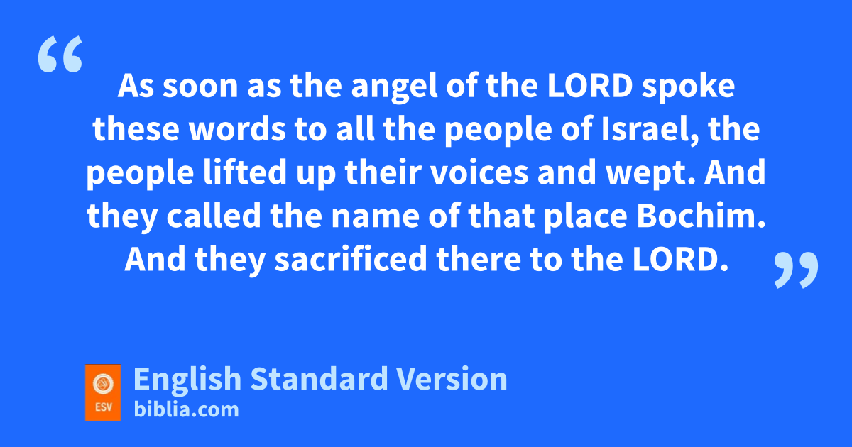 2 Now the angel of the Lord went up from Gilgal to jBochim. And he said, “I brought you up from Egypt and brought you into the land that I swore to give to your fathers. I said, k‘I will never break my covenant with you, 2 land you shall make no covenant with the inhabitants of this land; myou shall break down their altars.’ But you have not obeyed my voice. What is this you have done? 3 So now I say, nI will not drive them out before you, but they shall become othorns in your sides, and their gods shall be a snare to you.” 4 As soon as the angel of the Lord spoke these words to all the people of Israel, the people lifted up their voices and wept. 5 And they called the name of that place Bochim.1 And they sacrificed there to the Lord.