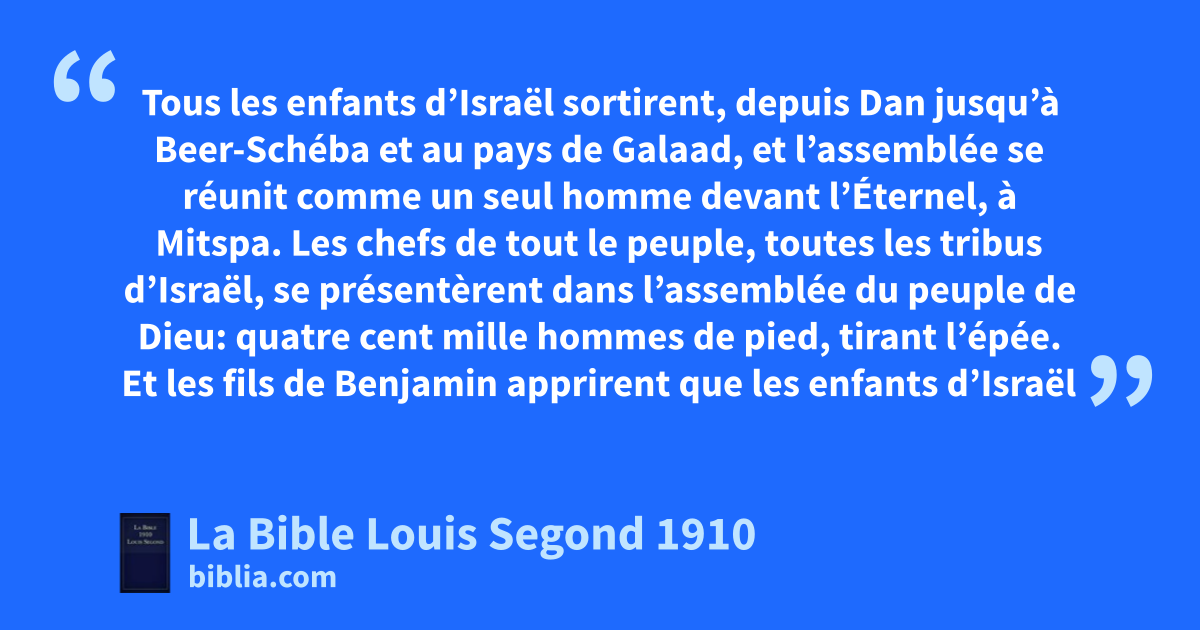 1Tous les enfants d’Israël sortirent, depuis Dan jusqu’à Beer-Schéba et au pays de Galaad, et l’assemblée se réunit comme un seul homme devant l’Éternel, à Mitspa. 2Les chefs de tout le peuple, toutes les tribus d’Israël, se présentèrent dans l’assemblée du peuple de Dieu: quatre cent mille hommes de pied, tirant l’épée. 3Et les fils de Benjamin apprirent que les enfants d’Israël étaient montés à Mitspa. Les enfants d’Israël dirent: Parlez, comment ce crime a-t-il été commis? 4Alors le Lévite, le mari de la femme qui avait été tuée, prit la parole, et dit: J’étais arrivé, avec ma concubine, à Guibea de Benjamin, pour y passer la nuit. 5Les habitants de Guibea se sont soulevés contre moi, et ont entouré pendant la nuit la maison où j’étais. Ils avaient l’intention de me tuer, et ils ont fait violence à ma concubine, et elle est morte. 6J’ai saisi ma concubine, et je l’ai coupée en morceaux, que j’ai envoyés dans tout le territoire de l’héritage d’Israël; car ils ont commis un crime et une infamie en Israël. 7Vous voici tous, enfants d’Israël; consultez-vous, et prenez ici une décision! 8Tout le peuple se leva comme un seul homme, en disant: Nul de nous n’ira dans sa tente, et personne ne retournera dans sa maison. 9Voici maintenant ce que nous ferons à Guibea: Nous marcherons contre elle d’après le sort. 10Nous prendrons dans toutes les tribus d’Israël dix hommes sur cent, cent sur mille, et mille sur dix mille; ils iront chercher des vivres pour le peuple, afin qu’à leur retour on traite Guibea de Benjamin selon toute l’infamie qu’elle a commise en Israël. 11Ainsi tous les hommes d’Israël s’assemblèrent contre la ville, unis comme un seul homme. 12Les tribus d’Israël envoyèrent des hommes vers toutes les familles de Benjamin, pour dire: Qu’est-ce que ce crime qui s’est commis parmi vous? 13Livrez maintenant ales gens pervers qui sont à Guibea, afin que nous les fassions mourir et que nous ôtions le mal du milieu d’Israël. bMais les Benjamites ne voulurent point écouter la voix de leurs frères, les enfants d’Israël. 14Les Benjamites sortirent de leurs villes, et s’assemblèrent à Guibea, pour combattre les enfants d’Israël. 15Le dénombrement que l’on fit en ce jour des Benjamites sortis des villes fut de vingt-six mille hommes, tirant l’épée, sans compter les habitants de Guibea formant sept cents hommes d’élite. 16Parmi tout ce peuple, il y avait sept cents hommes d’élite cqui ne se servaient pas de la main droite; tous ceux-là pouvaient, en lançant une pierre avec la fronde, viser à un cheveu sans le manquer. 17On fit aussi le dénombrement des hommes d’Israël, non compris ceux de Benjamin, et l’on en trouva quatre cent mille tirant l’épée, tous gens de guerre. 18Et les enfants d’Israël se levèrent, montèrent à Béthel, et consultèrent Dieu, en disant: Qui de nous montera le premier pour combattre les fils de Benjamin? l’Éternel répondit: Juda montera le premier.
