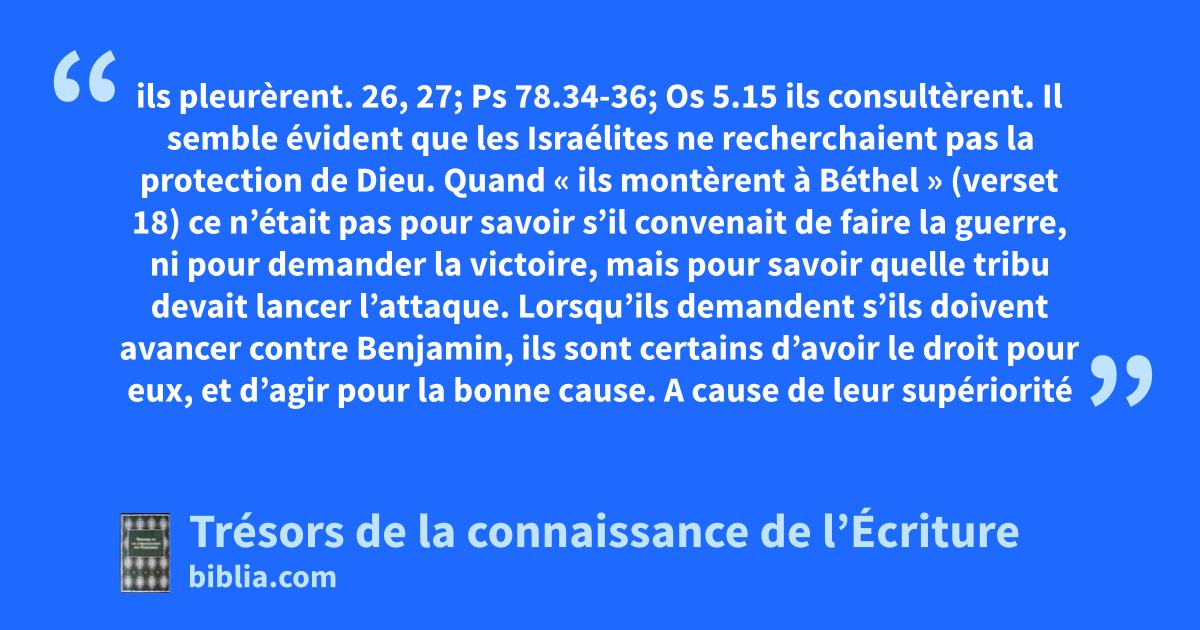 ils pleurèrent. 26, 27; Ps 78.34-36; Os 5.15 ils consultèrent. Il semble évident que les Israélites ne recherchaient pas la protection de Dieu. Quand « ils montèrent à Béthel » (verset 18) ce n’était pas pour savoir s’il convenait de faire la guerre, ni pour demander la victoire, mais pour savoir quelle tribu devait lancer l’attaque. Lorsqu’ils demandent s’ils doivent avancer contre Benjamin, ils sont certains d’avoir le droit pour eux, et d’agir pour la bonne cause. A cause de leur supériorité en nombre ils sont sûrs de leur succès. Mais Dieu les humilie et les livre aux mains de leurs ennemis. Il leur montre que ce n’est pas toujours le plus rapide qui gagne la course, et que la victoire n’est pas toujours pour le plus fort.