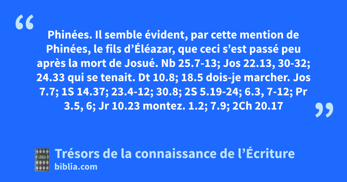 Phinées. Il semble évident, par cette mention de Phinées, le fils d’Éléazar, que ceci s’est passé peu après la mort de Josué. Nb 25.7-13; Jos 22.13, 30-32; 24.33 qui se tenait. Dt 10.8; 18.5 dois-je marcher. Jos 7.7; 1S 14.37; 23.4-12; 30.8; 2S 5.19-24; 6.3, 7-12; Pr 3.5, 6; Jr 10.23 montez. 1.2; 7.9; 2Ch 20.17