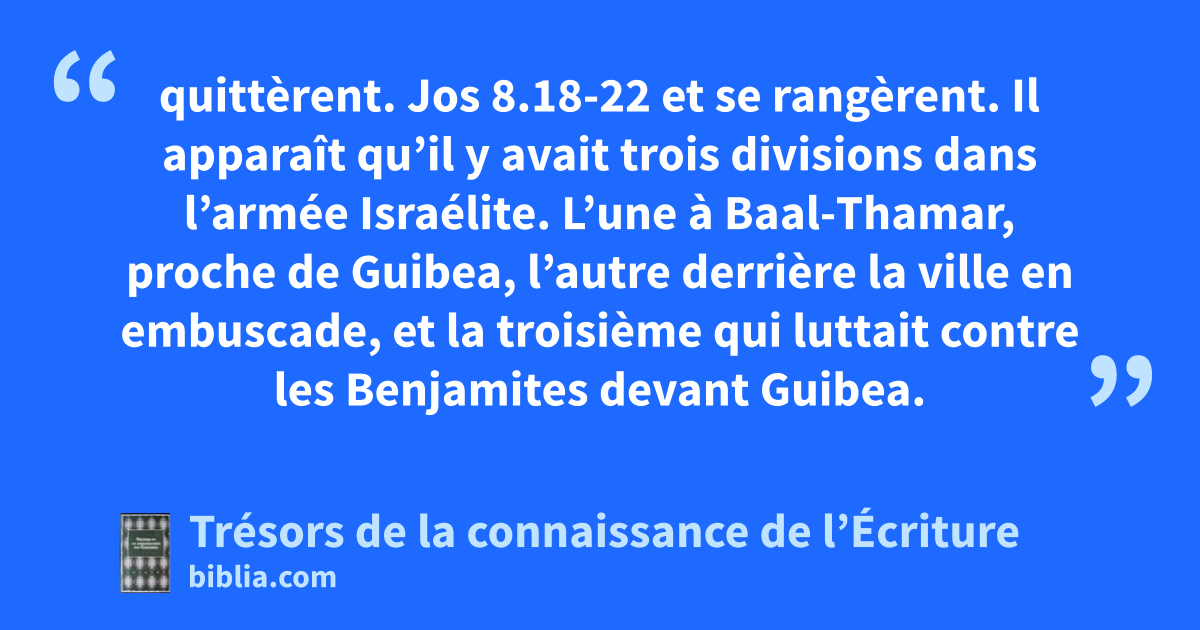 quittèrent. Jos 8.18-22 et se rangèrent. Il apparaît qu’il y avait trois divisions dans l’armée Israélite. L’une à Baal-Thamar, proche de Guibea, l’autre derrière la ville en embuscade, et la troisième qui luttait contre les Benjamites devant Guibea.