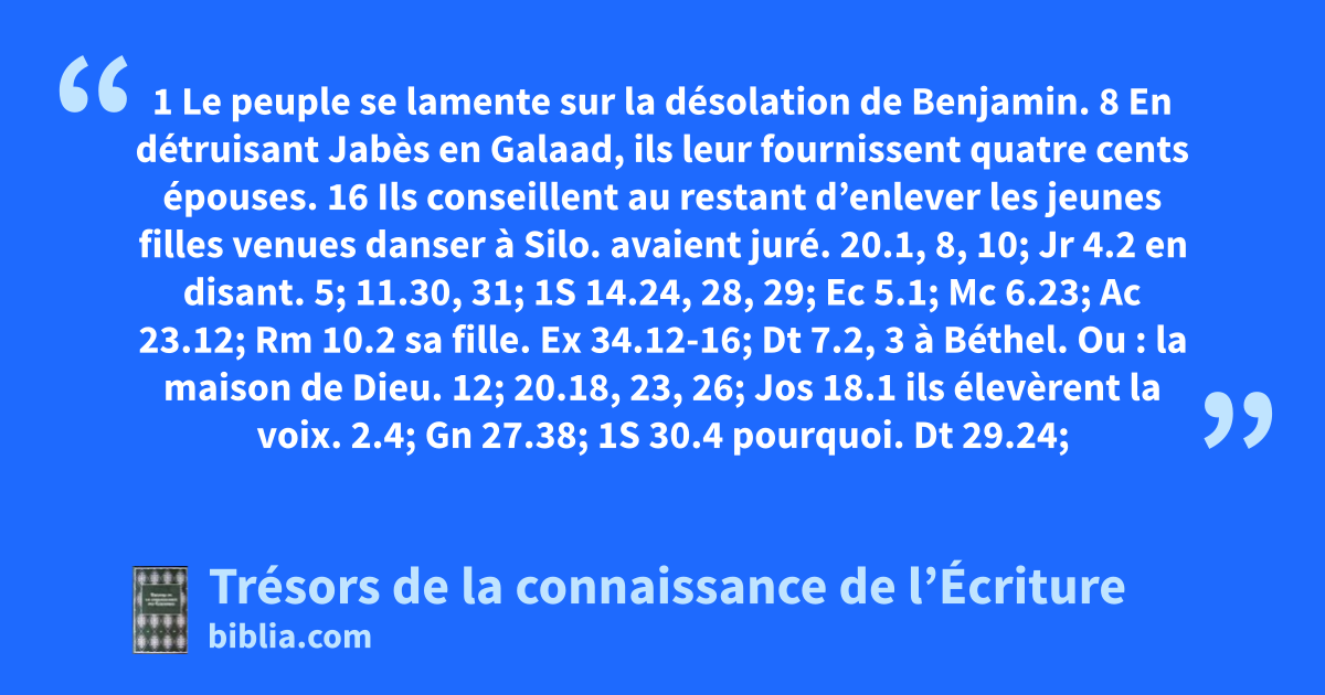 1 Le peuple se lamente sur la désolation de Benjamin. 8 En détruisant Jabès en Galaad, ils leur fournissent quatre cents épouses. 16 Ils conseillent au restant d’enlever les jeunes filles venues danser à Silo.