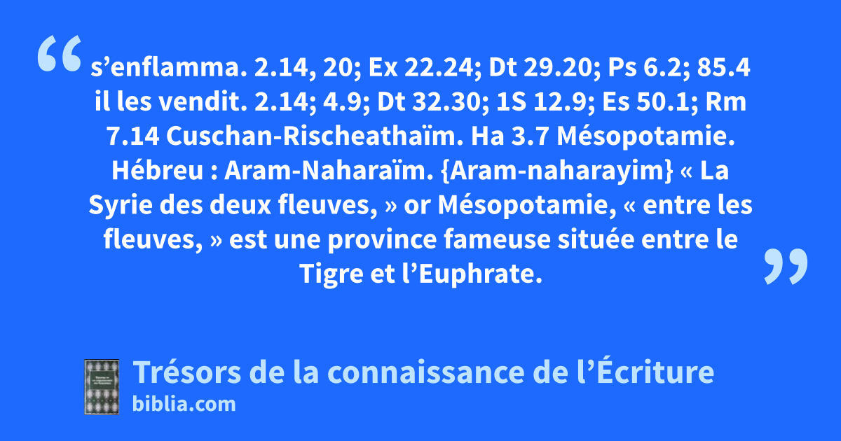 s’enflamma. 2.14, 20; Ex 22.24; Dt 29.20; Ps 6.2; 85.4 il les vendit. 2.14; 4.9; Dt 32.30; 1S 12.9; Es 50.1; Rm 7.14 Cuschan-Rischeathaïm. Ha 3.7 Mésopotamie. Hébreu : Aram-Naharaïm. {Aram-naharayim} « La Syrie des deux fleuves, » or Mésopotamie, « entre les fleuves, » est une province fameuse située entre le Tigre et l’Euphrate.
