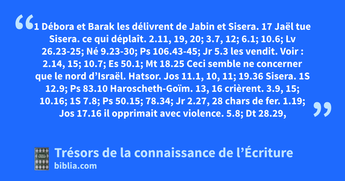 1 Débora et Barak les délivrent de Jabin et Sisera. 17 Jaël tue Sisera.