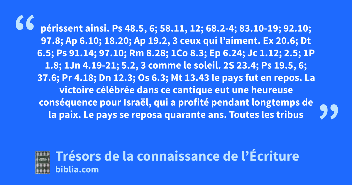 périssent ainsi. Ps 48.5, 6; 58.11, 12; 68.2-4; 83.10-19; 92.10; 97.8; Ap 6.10; 18.20; Ap 19.2, 3 ceux qui l’aiment. Ex 20.6; Dt 6.5; Ps 91.14; 97.10; Rm 8.28; 1Co 8.3; Ep 6.24; Jc 1.12; 2.5; 1P 1.8; 1Jn 4.19-21; 5.2, 3 comme le soleil. 2S 23.4; Ps 19.5, 6; 37.6; Pr 4.18; Dn 12.3; Os 6.3; Mt 13.43 le pays fut en repos. La victoire célébrée dans ce cantique eut une heureuse conséquence pour Israël, qui a profité pendant longtemps de la paix. Le pays se reposa quarante ans. Toutes les tribus ont marché dans la crainte de l’Éternel. 3.11, 30