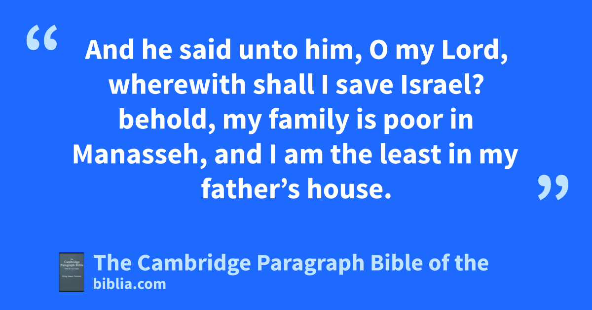 11 And there came an angel of the Lord, and sat under an oak which was in Ophrah, that pertained unto Joash lthe Abi-ezrite: and his son * Gideon mthreshed wheat by the winepress, * to hide it from the Midianites. 12 And the nangel of the Lord appeared unto him, and said unto him, The Lord is owith thee, thou mighty man of valour. 13 And Gideon said unto him, O my lord, if the Lord be with us, why then is all this pbefallen us? and qwhere be all his miracles rwhich our fathers told us of, saying, Did not the Lord bring us up from Egypt? but now the Lord hath forsaken us, and delivered us into the hands of the bMidianites. 14 And the Lord looked upon him, and said, sGo in this thy might, and thou shalt save Israel from the hand of the bMidianites: thave not I sent thee? 15 And he said unto him, O my Lord, wherewith shall I save Israel? behold, u* my family is poor in Manasseh, and I am the least in my father’s house. 16 And the Lord said unto him, wSurely I will be with thee, and thou shalt smite the bMidianites as one man. 17 And he said unto him, If now xI have found grace in thy sight, then yshew me a sign that thou talkest with me. 18 zDepart not hence, I pray thee, until I come unto thee, and bring forth my * present, and set it before thee. And he said, I will tarry until thou come again.