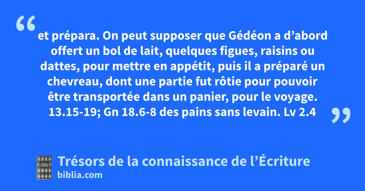 et prépara. On peut supposer que Gédéon a d’abord offert un bol de lait, quelques figues, raisins ou dattes, pour mettre en appétit, puis il a préparé un chevreau, dont une partie fut rôtie pour pouvoir être transportée dans un panier, pour le voyage. 13.15-19; Gn 18.6-8 des pains sans levain. Lv 2.4