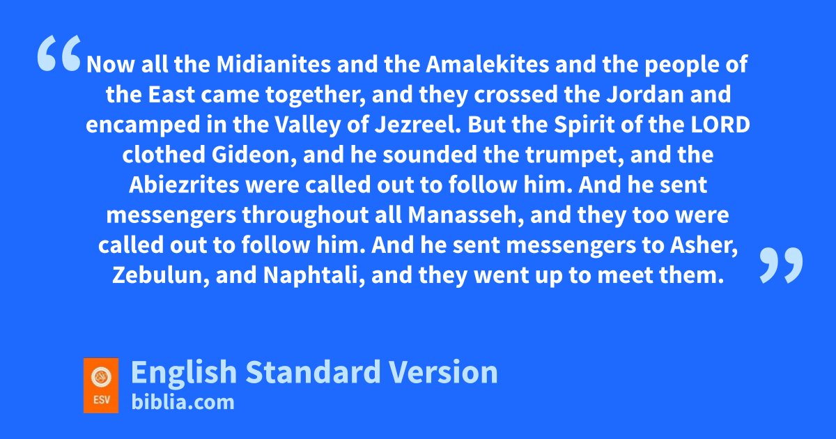 33 Now tall the Midianites and the Amalekites and the people of the East came together, and they crossed the Jordan and encamped in uthe Valley of Jezreel. 34 But vthe Spirit of the Lord clothed Gideon, wand he sounded the trumpet, and the Abiezrites were called out to follow him. 35 xAnd he sent messengers throughout all Manasseh, and they too were called out to follow him. xAnd he sent messengers to Asher, Zebulun, and Naphtali, and they went up to meet them.