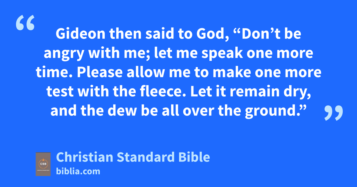 39 Gideon then said to God, “Don’t be angry with me; let me speak one more time. Please allow me to make one more test with the fleece. Let it remain dry, and the dew be all over the ground.” 40 That night God did as Gideon requested: only the fleece was dry, and dew was all over the ground.
