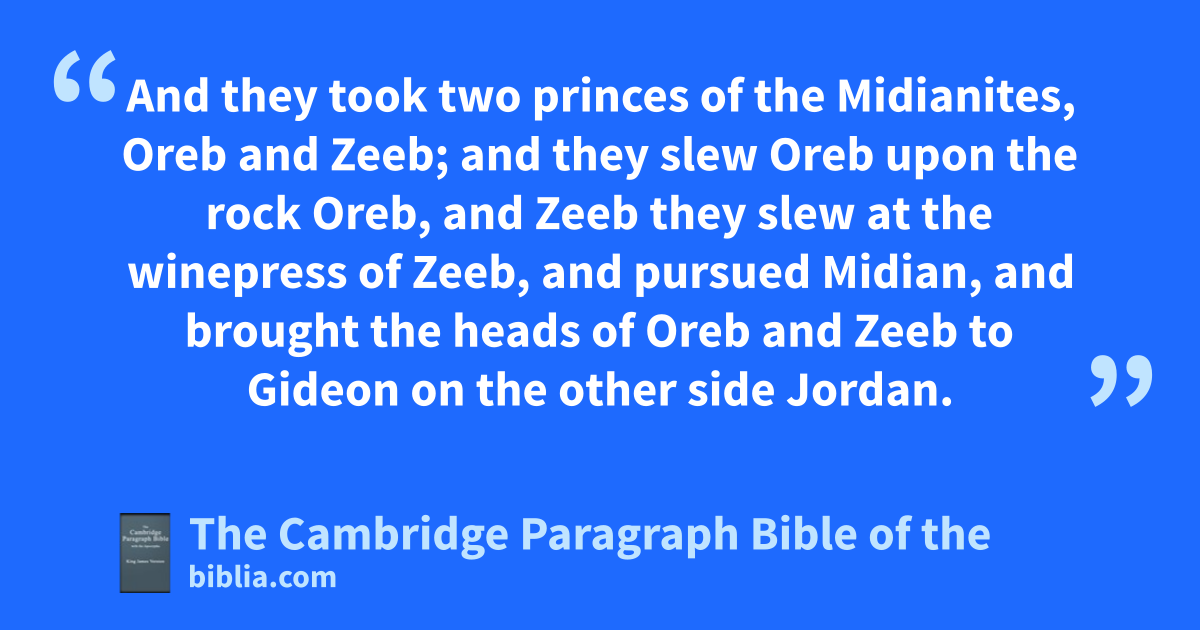 24 And Gideon sent messengers throughout all amount Ephraim, saying, Come down against the Midianites, and take before them the waters unto Beth-barah and Jordan. Then all the men of Ephraim ygathered themselves together, and btook the waters unto cBeth-barah and Jordan. 25 And they took dtwo princes of the Midianites, Oreb and Zeeb; and they slew Oreb upon ethe rock Oreb, and Zeeb they slew at the winepress of Zeeb, and pursued Midian, and brought the heads of Oreb and Zeeb to Gideon on the other side Jordan.