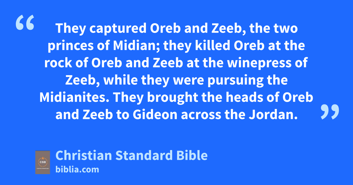 24 Gideon sent messengers throughout the hill country of Ephraim with this message: “Come down to intercept the Midianites and take control of the watercourses ahead of them as far as Beth-barah and the Jordan.” So all the men of Ephraimf were called out, and they took control of the watercourses as far as Beth-barah and the Jordan. 25 They captured Oreb and Zeeb, the two princes of Midian; they killed Oreb at the rock of Oreb and Zeeb at the winepress of Zeeb, while they were pursuing the Midianites. They brought the heads of Oreb and Zeeb to Gideon across the Jordan.