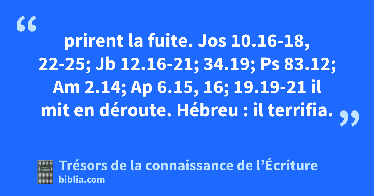 prirent la fuite. Jos 10.16-18, 22-25; Jb 12.16-21; 34.19; Ps 83.12; Am 2.14; Ap 6.15, 16; 19.19-21 il mit en déroute. Hébreu : il terrifia.