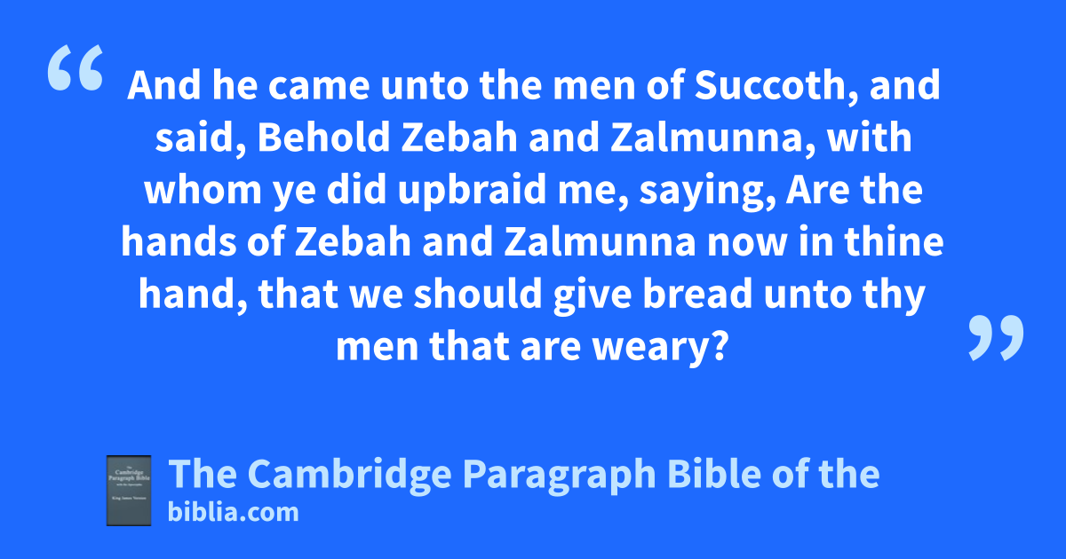 13 And Gideon the son of Joash returned from battle before the sun was up, 14 and caught a young man of the men of Succoth, and inquired of him: and he * described unto him the princes of Succoth, and the elders thereof, even threescore and seventeen men. 15 And he came unto the men of Succoth, and said, Behold Zebah and Zalmunna, with whom ye did upbraid me, saying, rAre the hands of Zebah and Zalmunna now in thine hand, that we should give bread unto thy men that are weary? 16 rAnd he took the elders of the city, and thorns of the wilderness and briers, and with them he * taught the men of Succoth. 17 sAnd he beat down the tower of Penuel, and slew the men of the city. 18 Then said he unto Zebah and Zalmunna, What manner of men were they whom ye slew at tTabor? And they answered, As thou art, so were they; each one * resembled the children of a king. 19 And he said, They were my brethren, even the sons of my mother: uas the Lord liveth, if ye had saved them alive, I would not slay you. 20 And he said unto Jether his firstborn, Up, and slay them. But the youth drew not his sword: for he feared, because he was yet a youth. 21 Then Zebah and Zalmunna said, Rise thou, and fall upon us: for as the man is, so is his strength. And Gideon arose, and vslew Zebah and Zalmunna, and took away the * ornaments that were on their camels’ necks.