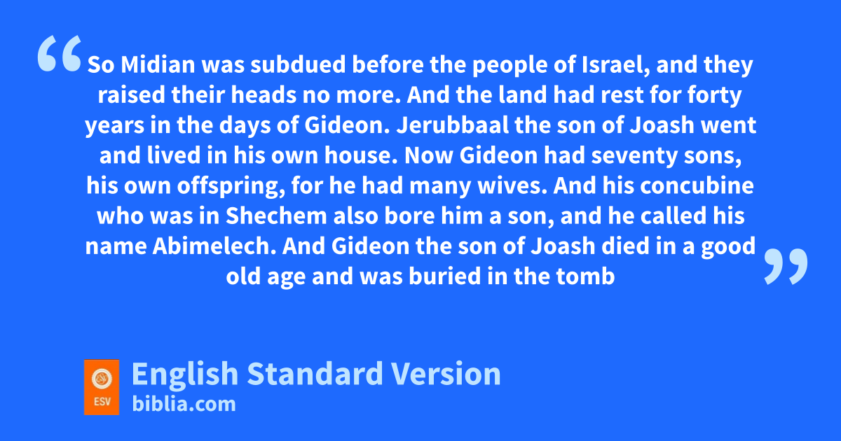 29 fJerubbaal the son of Joash went and lived in his own house. 30 Now Gideon had gseventy sons, his own offspring,3 for he had many wives. 31 And his concubine hwho was in Shechem also bore him a son, and he called his name Abimelech. 32 And Gideon the son of Joash died iin a good old age and was buried in the tomb of Joash his father, jat Ophrah of the Abiezrites.