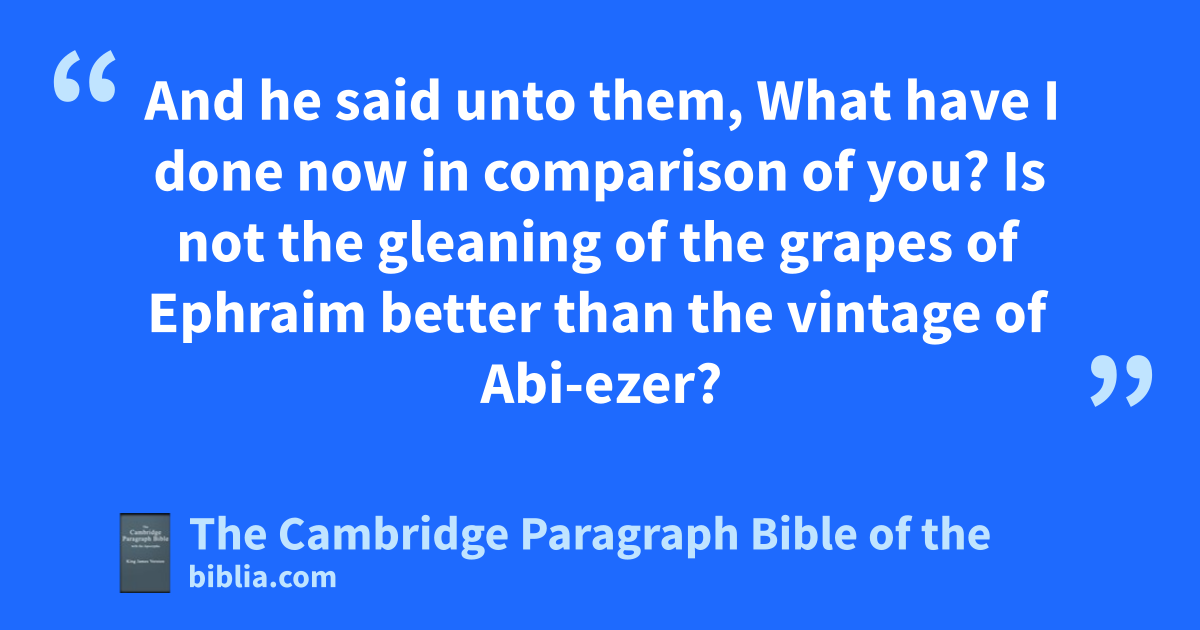 VIII. And athe men of Ephraim said unto him, * Why hast thou served us thus, that thou calledst us not, when thou wentest to fight with the Midianites? And they did chide with him * sharply. 2 And he said unto them, What have I done now in comparison of you? Is not bthe gleaning of the grapes of Ephraim better than the vintage of Abi-ezer? 3 cGod hath delivered into your hands the princes of Midian, Oreb and Zeeb: and what was I able to do in comparison of you? Then their * danger was abated toward him, when he had said that.