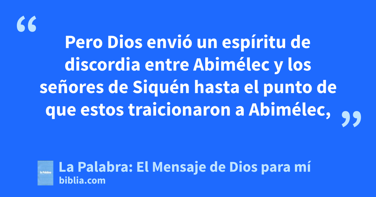 22 Abimélec gobernó durante tres años en Israel. 23 Pero Dios envió un espíritu de discordia entre Abimélec y los señores de Siquén hasta el punto de que estos traicionaron a Abimélec, 24 para que el crimen cometido contra los setenta hijos de Jerubaal fuera vengado y su sangre cayera sobre su hermano Abimélec, que los había asesinado, y sobre los señores de Siquén que le habían ayudado a asesinar a sus hermanos. 25 Los señores de Siquén pusieron contra él emboscadas en las cumbres de los montes y saqueaban a todo el que pasaba cerca por el camino. Se dio aviso de ello a Abimélec.